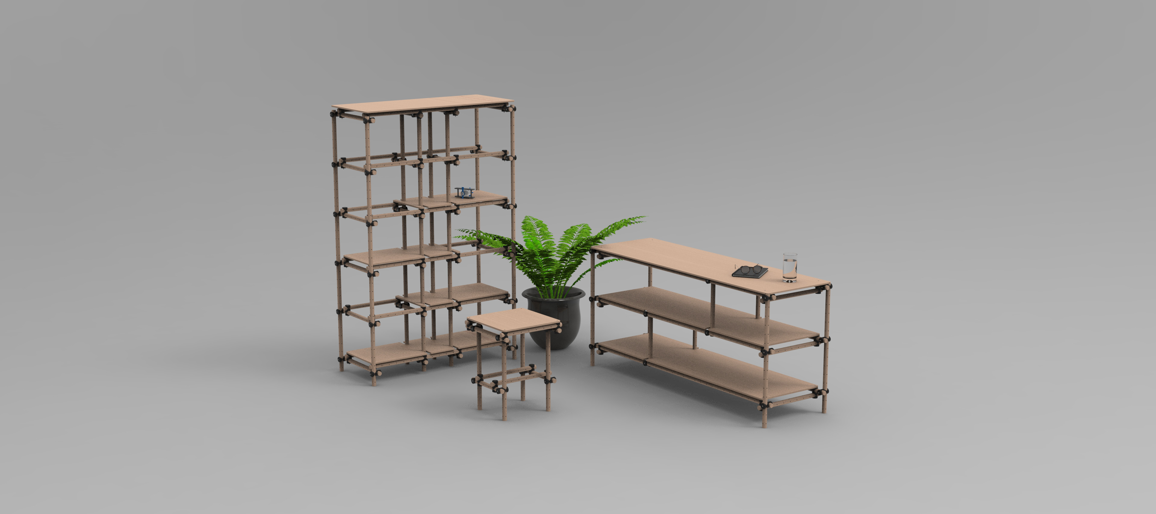Der Fokus in diesem Möbelsystem liegt auf der Skalierbarkeit der Verbindungen und dazugehörigen Grundbausteine. Durch den Research ergab sich, dass die meisten modulare Systeme, Probleme mit kleinen und filigranen Gebilde.